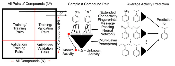 The approach consists of a machine learning model that takes a pair of compounds as input instead of a single compound. In the training phase, pairs are sampled from the set of training compounds, and the model learns the activity difference between the two compounds. Through this mechanism, representations of pairs of compounds and the structural changes between them are learned and activity differences are predicted from these structural differences. The pairwise comparison approach can be invariant to the representation of the individual compounds, allowing the use of a wide range of different molecular representations. The compared representations in this work are two implementations of Message Passing Neural Networks (Neural fingerprints from Duvenaud et al. 2015 and Chemprop fingerprints from Yang et al. 2019), extended-connectivity fingerprints (ECFP), and a novel “collision-free” form of ECFP. “Collision-free” ECFP, as the name suggests are impervious to fingerprint hash collisions that affect regular ECFP. The developed pairwise models were validated using 5-fold cross-validation under two different data splitting scenarios, random splitting, as is typical of machine learning models, and scaffold splitting, which more closely resembles real-world scenarios.