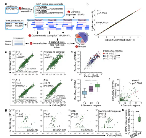 MHC-I-associated peptides deriving from non-coding genomic regions and mutations can generate tumor-specific antigens, including neoantigens. Quantifying tumor-specific antigens’ RNA expression in malignant and benign tissues is critical for discriminating actionable targets. We present BamQuery, a tool attributing an exhaustive RNA expression to MHC-I-associated peptides of any origin from bulk and single-cell RNA-sequencing data. We show that many cryptic and mutated tumor-specific antigens can derive from multiple discrete genomic regions, abundantly expressed in normal tissues. BamQuery can also be used to predict MHC-I-associated peptides immunogenicity and identify actionable tumor-specific antigens de novo.,